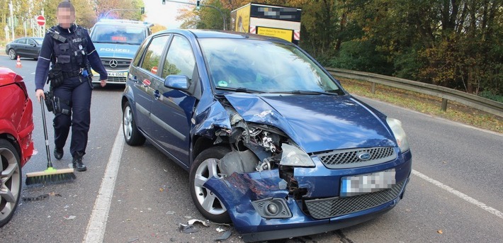 Auf der Berghausener Straße in Langenfeld wurden bei einem Auffahrunfall am gestrigen Montagnachmittag, 6. November 2023, drei Autos beschädigt und eine Person leicht verletzt