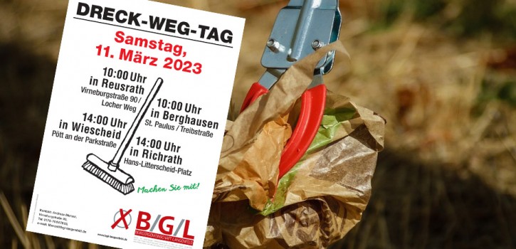 Die Bürgergemeinschaft Langenfeld (BGL) lädt am 11. März 2023 zum traditionellen „Dreck-weg-Tag“ in vier Stadtteilen ein. In Reusrath, Treffpunkt Virneburgstraße 90/ Ecke Locher Weg, soll dieser um 10 Uhr starten und parallel dazu in Berghausen, Treffpunkt Sankt Paulus/Treibstraße.