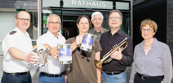 BU: Freuen sich über das Spendenergebnis (v.l.): Frederic Schildt (Leiter der Jugendfeuerwehr), Bürgermeister Frank Schneider (Schirmherr des Konzertes), Sonja Steinsiek (Leiterin der Musikschule), Norbert Viol (Schatzmeister des Fördervereins der Musikschule), Thomas Forkert (Fachleiter der Bläserklasse an der Kopernikus-Realschule) und Dr. Eva-Maria Kaufmann (Vorsitzende des SkF Langenfeld).