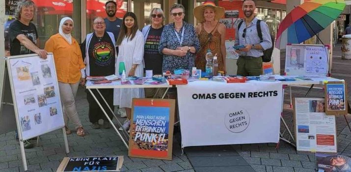 Für Humanität, Menschenrechte … Die Langenfelder Omas gegen Rechts – Kunterbunt hatten am 17. Juni 2023 gemeinsam mit dem Flüchtlingshilfe Verein Langenfeld einen Infostand in der Stadt.