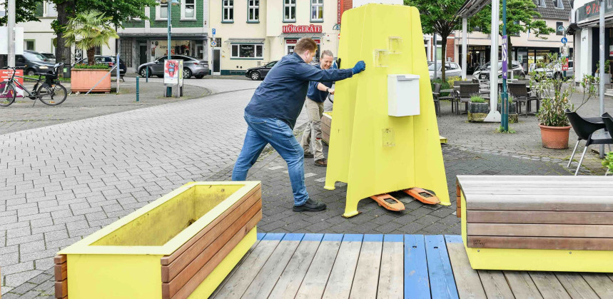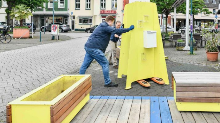 Am Freitag wurden die Stadtmöbel, die den Richrather Ortskern in den vergangenen sieben Wochen geprägt haben, durch den Projektpartner „Zukunftsnetz Mobilität NRW“ abgebaut.