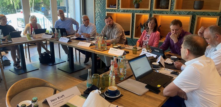 BU: Langenfelds Bürgermeister Frank Schneider (4. v. l.) und Solingens Oberbürgermeister Tim Kurzbach (5. v. r.) im Austausch mit den Vertretern der Ressortleitungen beider Verwaltungen.