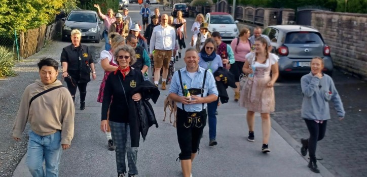 Zum zweiten Mal hat der Langenfelder Verein K.G. Prinzengarde zu einer Oktoberfestwanderung durch Langenfeld eingeladen. So ging es am ersten Sonntag im Oktober – dem letzten Wies’n- Wochenende – für rund 35 Mitglieder in Tracht und bei strahlendem Sonnenschein vom Marktplatz in Langenfeld zu Fuß bis zur Reitanlage Schork. „Ausgelassene Stimmung kam bei Bier, Schnaps und Gute-Laune-Musik bereits bei der Wanderung auf. Nach etwa der Hälfte der Strecke gab es zur Stärkung eine Brotzeit. Wer nicht mehr laufen konnte, wurde die letzten Kilometer stilecht mit einem Planwagen zum Hof gebracht. Am Ziel wartete ein kleines Oktoberfest mit Brezeln, Würstchen und Tanzmusik“, berichtet Pressewartin Sabine Feinen.