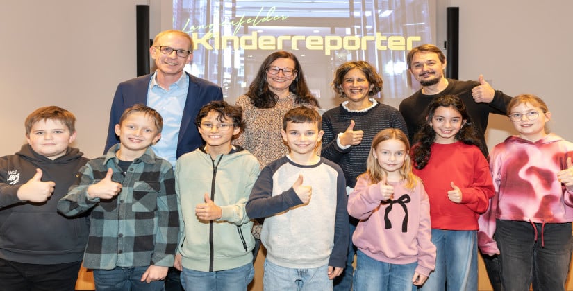 (v.l.): Jonas, Maximilian, Matheo, Oscar, Marie, Antonia und Katharina. Antonio (nicht auf dem Foto) komplettierte das Team. Mit den Kinderreportern auf dem Foto (v.l.) Bürgermeister Gerold Wenzens, Ingrid Graser (städtische Kinder- und Jugendbeteiligung), Dr. Carolin Ulbricht (vhs Langenfeld) und Remigius Rupik (Rupik-Marketing).