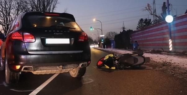 Mitsamt dem Roller stürzte er zu Boden, rutschte mit seinem Fahrzeug über die Fahrbahn und prallte zudem gegen einen der Hinterreifen des beteiligten Porsche.
