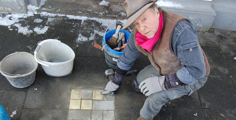 Früher gab es in Langenfeld eine aktive jüdische Gemeinschaft. Das Schicksal einiger Mitglieder wird während einer Fahrradtour für Heranwachsende (12 bis 27 Jahre) am 2. September 2024 erzählt. Dabei werden Stolpersteine (Archivfoto: Gunter Demnig bei der Verlegung auf der Bahnstraße) poliert und Blumen niederlegt.