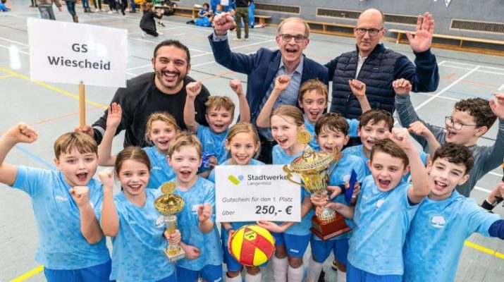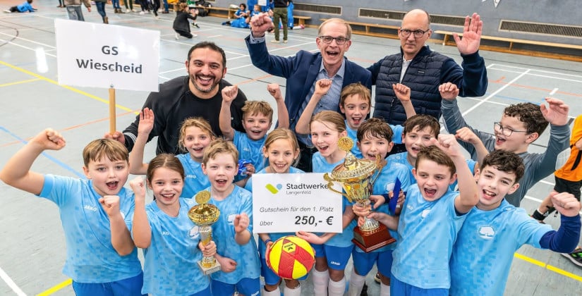 Bereits um 7.30 Uhr sicherten sich die ersten Fangruppen ihre Sitzplätze in der KAG-Sporthalle in Langenfeld. Eine Stunde liefen später die zehn Teams aus allen Grundschulen zum Auftakt des 26. Fußball-Stadtwerke-Cups in die Halle ein. Vor „voller Hütte“ lieferten sich die Grundschulen spannende und hochklassige Spiele. Unterstützt von den Fans galt dabei zu jeder Zeit das Motto „Fair geht vor“. In einem spannenden und stimmungsvollen Finale setzte sich letztendlich die Grundschule Wiescheid durch und durfte anschließend den von Bürgermeister Gerold Wenzens überreichten Wanderpokal in die Höhe stemmen.