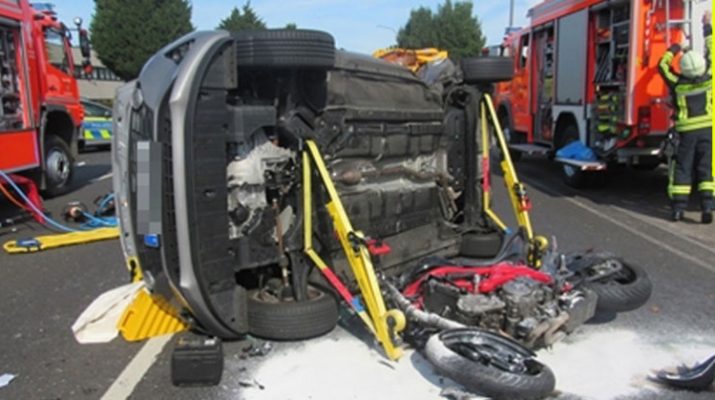 Beim Zusammenstoß eines Motorrades mit einem PKW in Langenfeld am Dienstagmorgen, 26. August 2025, wurden zwei Personen lebensgefährlich, ein drittes Opfer schwer verletzt. Der Wagen wurde dabei auf die Seite geschleudert.